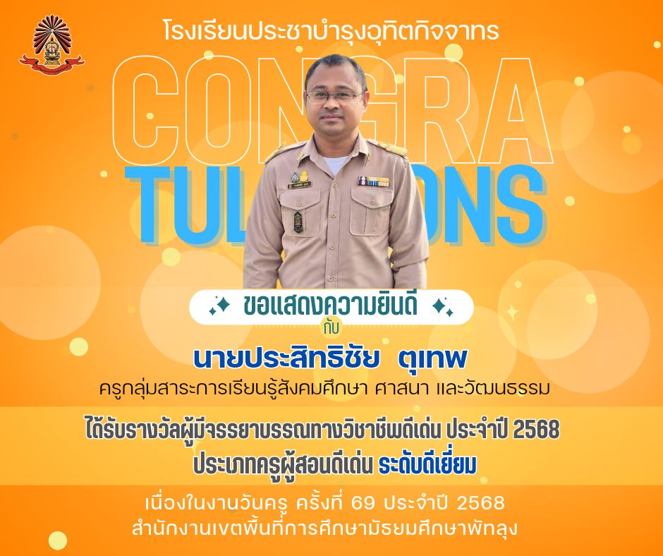 โรงเรียนประชาบำรุงอุทิตกิจจาทรขอแสดงความยินดีกับคุณครูประสิทธิชัย ตุเทพได้รับรางวัล“ครูผู้สอนดีเด่น” ระดับดีเยี่ยมเนื่องในวันครู ครั้งที่ ๖๙ ประจำปี ๒๕๖๘ 20 มกราคม 2568 admin ผลงานนักเรียน/ครูFacebookFacebookXXLINELine admin
